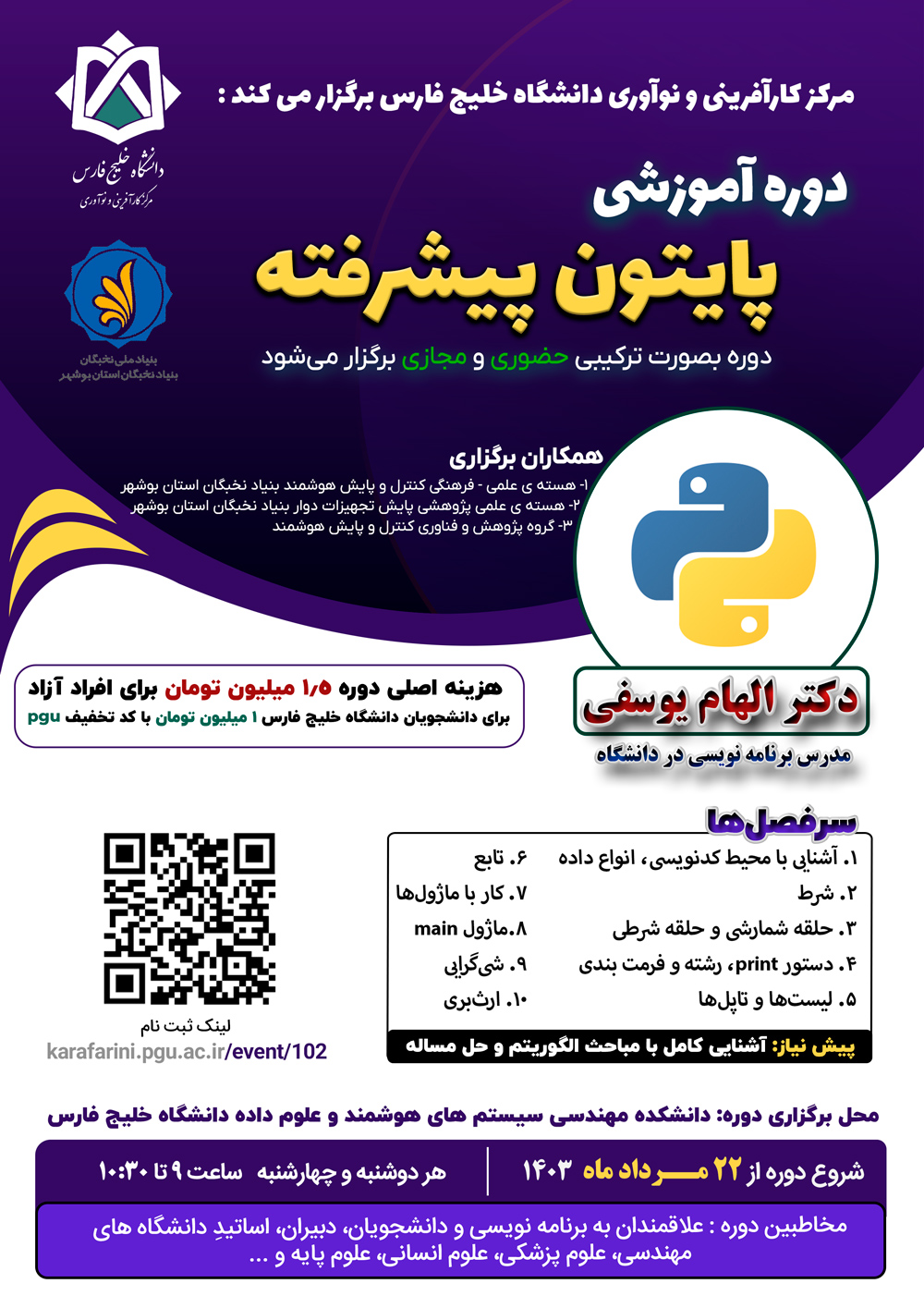 محل برگزاری : دانشکده مهندسی سیستمهای هوشمند و علوم داده دانشگاه خلیج فارس