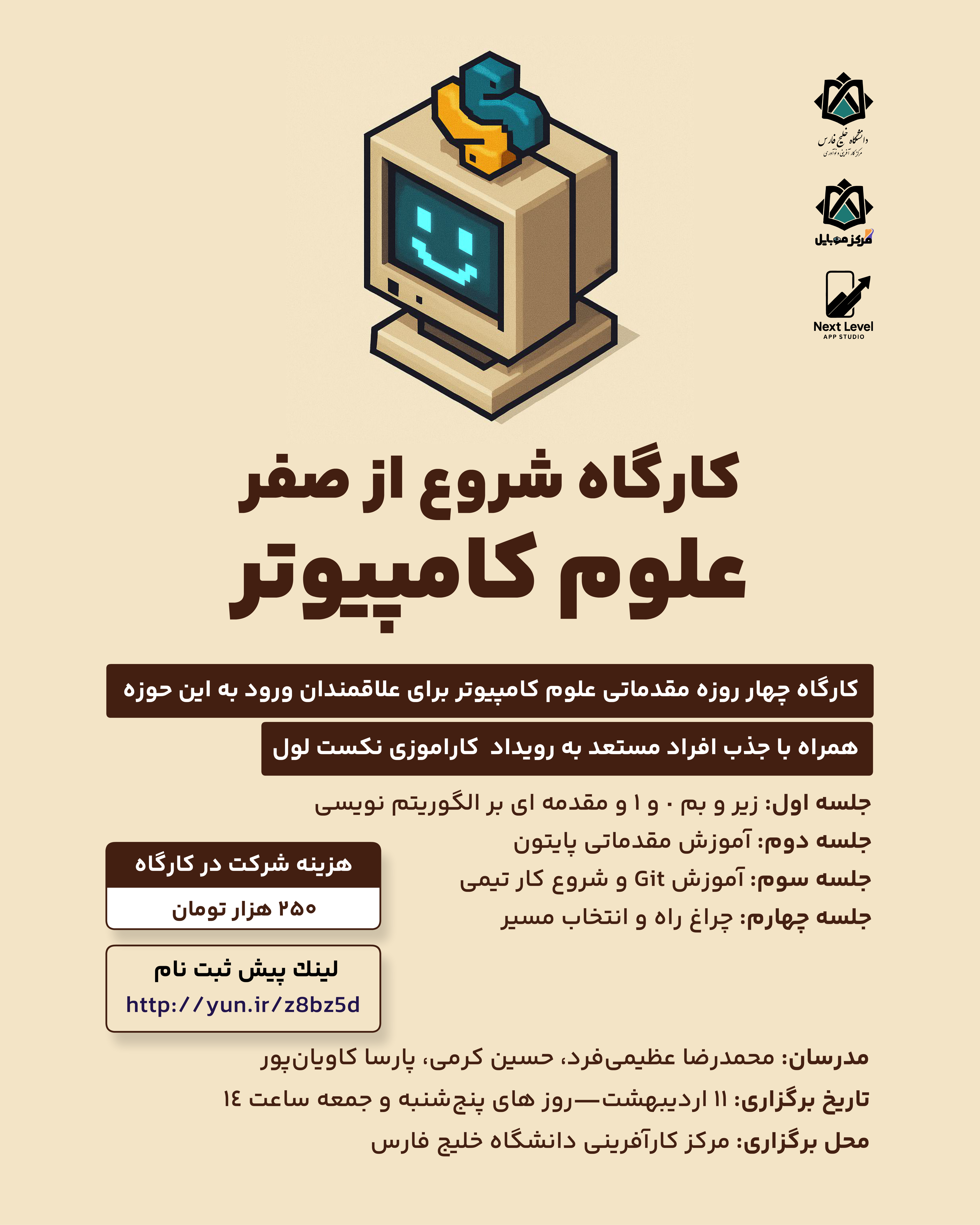 کارگاه شروع از صفر علوم کامپیوتر اگه همیشه دوست داشتی بدونی علوم کامپیوتر دقیقاً چیه و چطور میتونی وارد این حوزه جذاب بشی، این کارگاه مخصوص توئه!