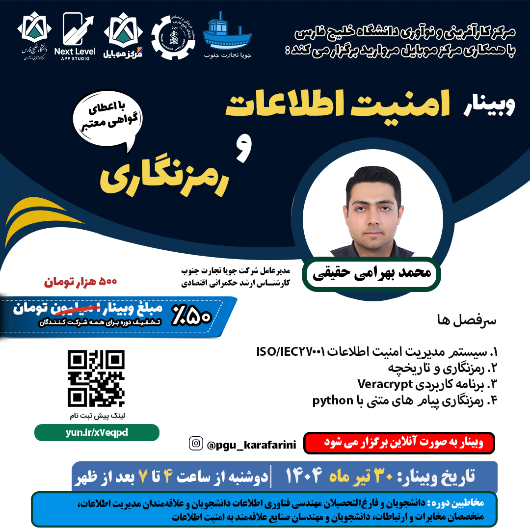 رویداد تخصصی امنیت اطلاعات و رمزنگاری در دنیای امروز، امنیت دادهها یک ضرورت غیرقابل انکاره... با ما همراه باشید در وبیناری کاربردی با تدریس جناب آقای محمد بهرامی حقیقی
