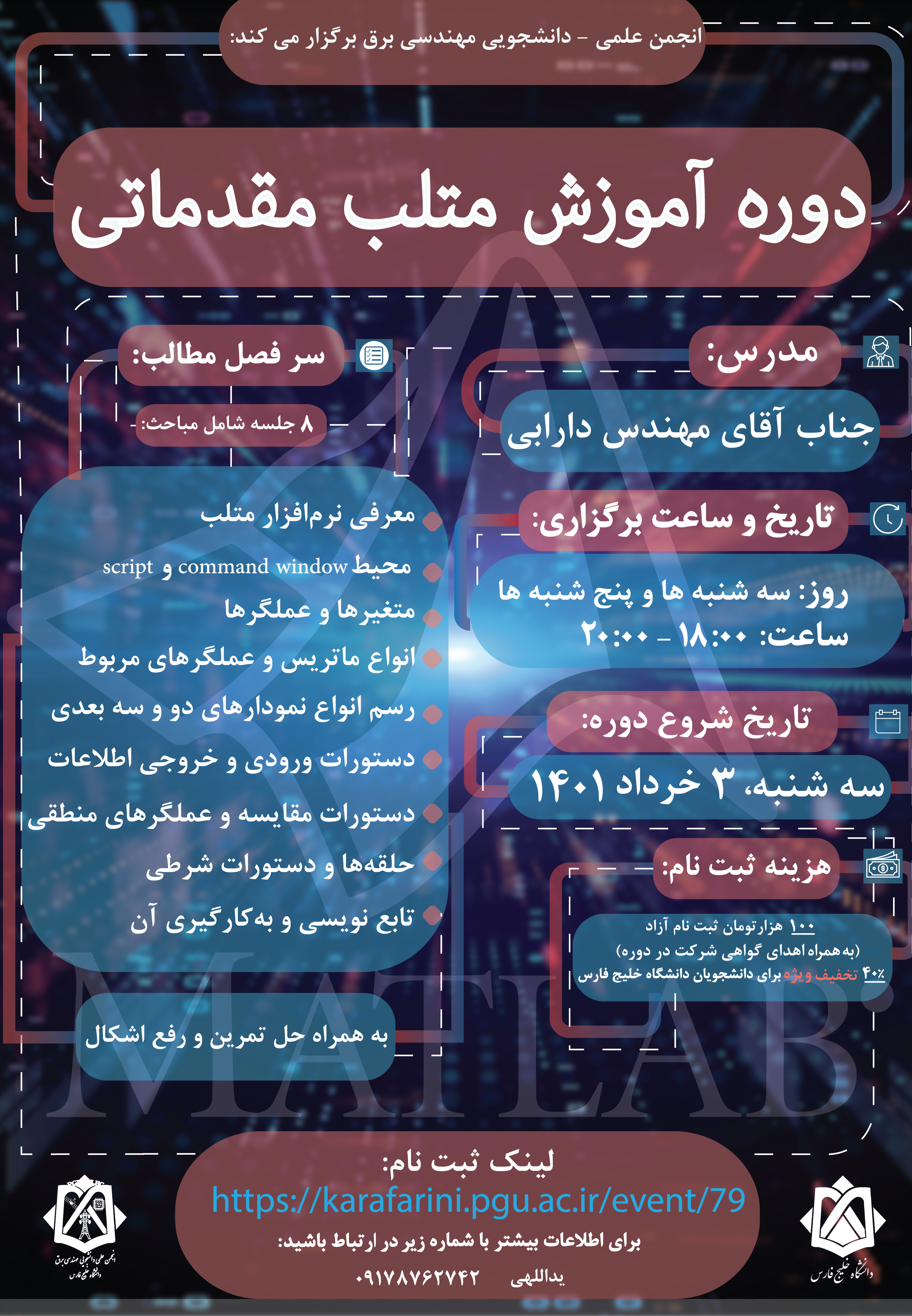 سرفصل مطالب: معرفی نرم افزار متلب محیط ویندوز متغییرها و عملگرها رسم انواع نمودارها دو و سه بعدی دستورات ورودی و خروجی دستورات مقایسه و عملگرهای منطقی تابع نویسی و به کار گیری آن