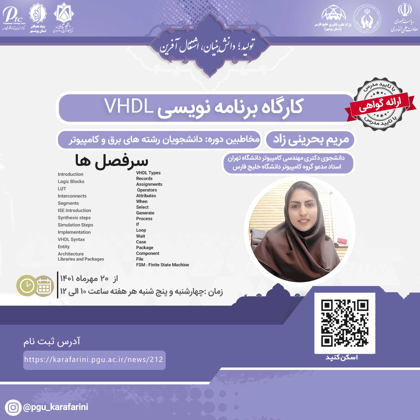 کارگاه 14 جلسه 2 ساعته یعنی کلا 28 ساعت می باشد. چهارشنبه و پنج شنبه هر هفته ساعت 10-12 شروع دوره : 20 مهر 1401 اتمام دوره : 3 آذر 1401 مدرس : مریم بحرینی زاد (دانشجوی دکتری مهندسی کامپیوتر دانشگاه تهران، استاد مدعو گروه کامپیوتر دانشگاه خلیج فارس) ایمیل : Bahreynizad@yahoo.com