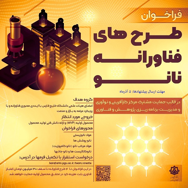 مخاطب: اعضای هیات علمی دانشگاه خلیج فارس با ایده ی محوری فناورانه حوزه نانو و با رویکرد عرضه به بازار و صنعت